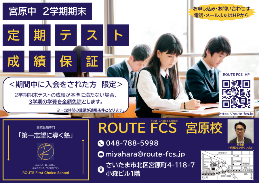 ROUTE FCS宮原校では、2学期期末テストに向けて「成績保証」キャンペーンを開催します。