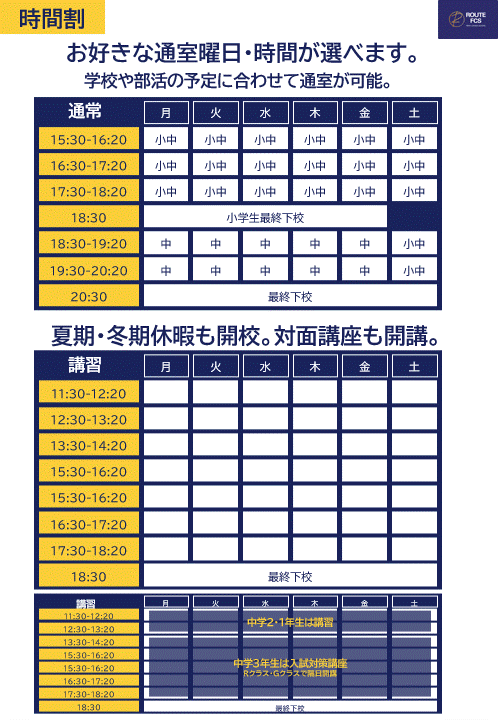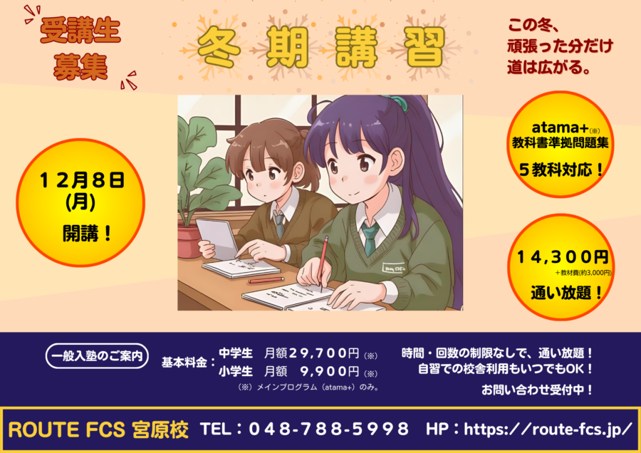 ROUTE FCS宮原校では、中学2・1年生を対象とした冬期講習を開講します。