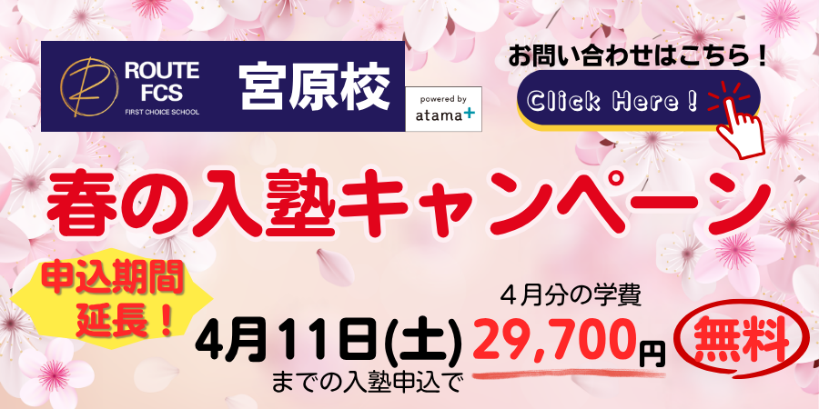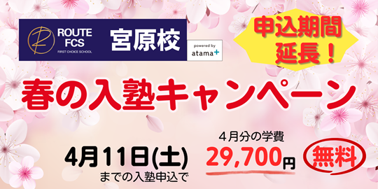 2026.03.30 〔期間延長〕【宮原校】『春の入塾キャンペーン』のご案内 新年度入塾生対象「春の入塾キャンペーン」実施! 好評につき、申込期間を延長します! 4月11日(土)までに入塾をお申し込みの方限定で 4月分のメインプログラム学費(29,700円)が無料! ※入会金は0円です。 ※徹底対策講座受講料・テスト受験料・教材費は別途必要となります。 どなたでもキャンペーンの対象となります! ※3か月以上の通塾が条件となります。 ROUTE FCS 宮原校で新年度のスタートを切りましょう! ↓入塾のお問い合わせはバナーをタップ!↓